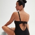 Dieser elegante schwarze Badeanzug mit asymmetrischer Silhouette versprüht Glamour am Pool. Er verfügt über ein raffiniertes einschultriges Design und eine atemberaubende Schnürung am Rücken für eine individuelle Passform. Das schicke Design wird durch einen geprägten Goldring am verstellbaren Träger und abnehmbare BH-Pads für Halt und Formgebung abgerundet. Aus unserem hochwertigen bequemen, figurformenden Material, das dem Körper schmeichelt und ihn konturiert. Ideal für Strand und Pool. Unser neues figurformendes Material mit CREORA® HighClo™, das eine höhere Chlorbeständigkeit als herkömmliche Bademodestoffe bietet, sitzt länger wie neu. Das Nylongarn in unserem neuen formgebenden Material wird auch zu 100 % aus Abfällen hergestellt, wie zum Beispiel aus Stoffresten aus Fabriken.